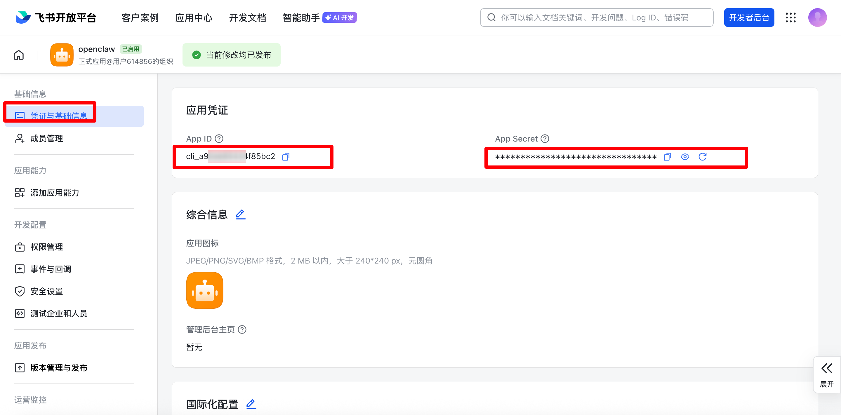 在应用的 凭证与基础信息 页面,复制: