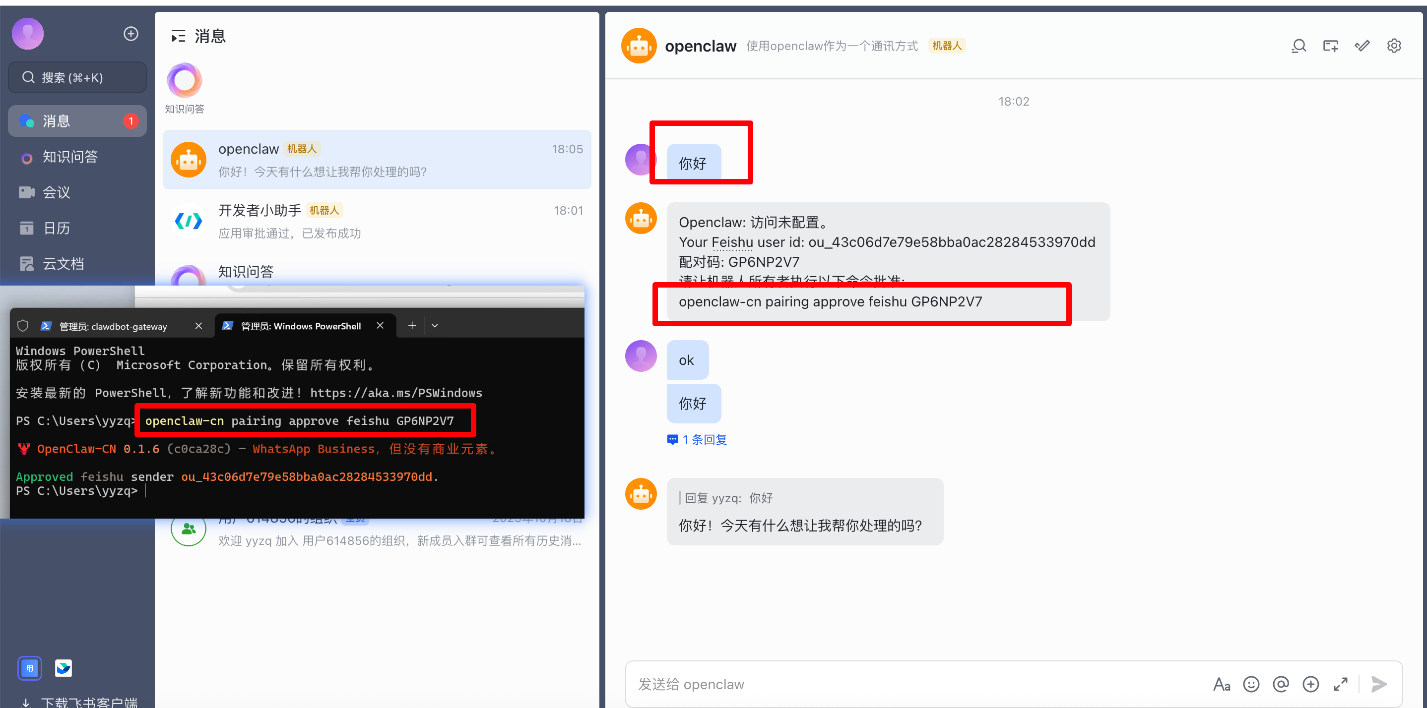 openclaw-cn pairing approve feishu <配对码>