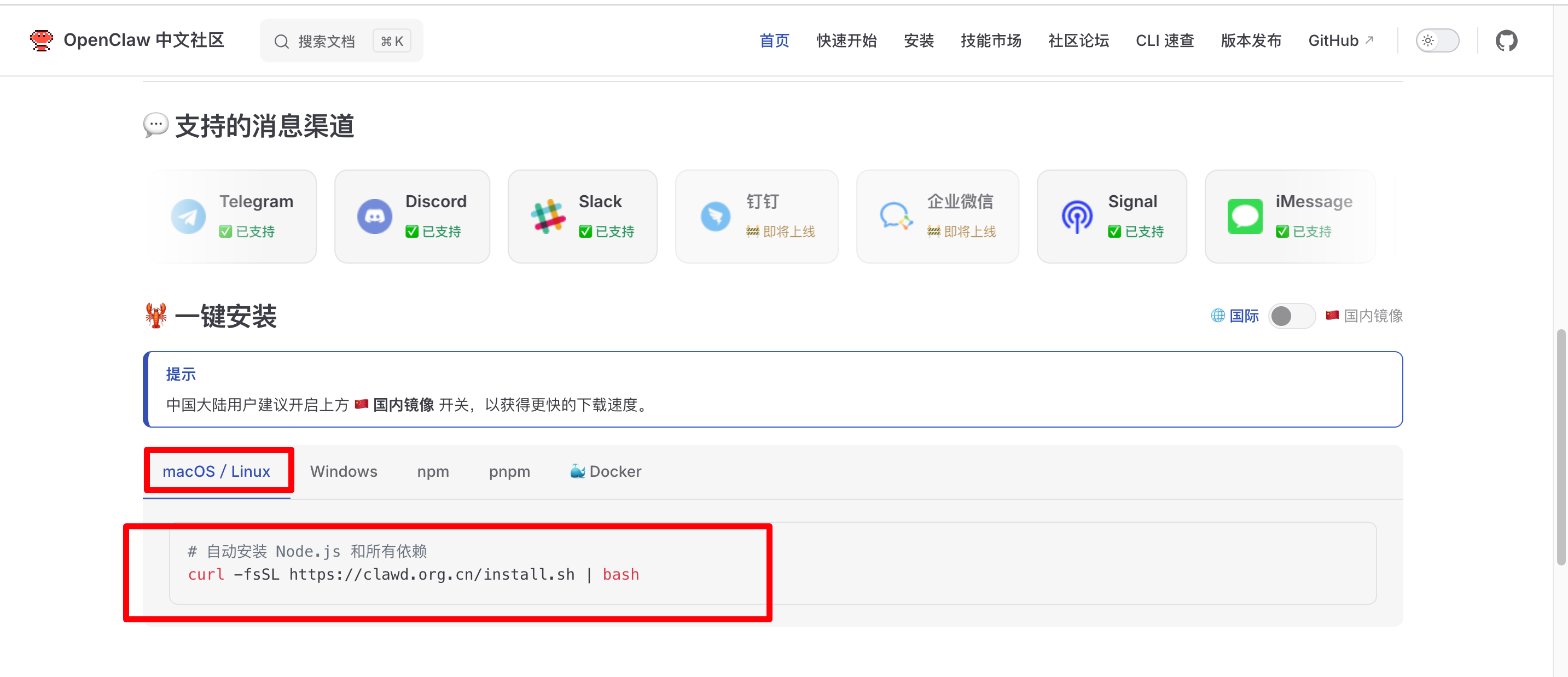 然后就是打开OpenClaw 中文社区使用一键安装脚本进行安装