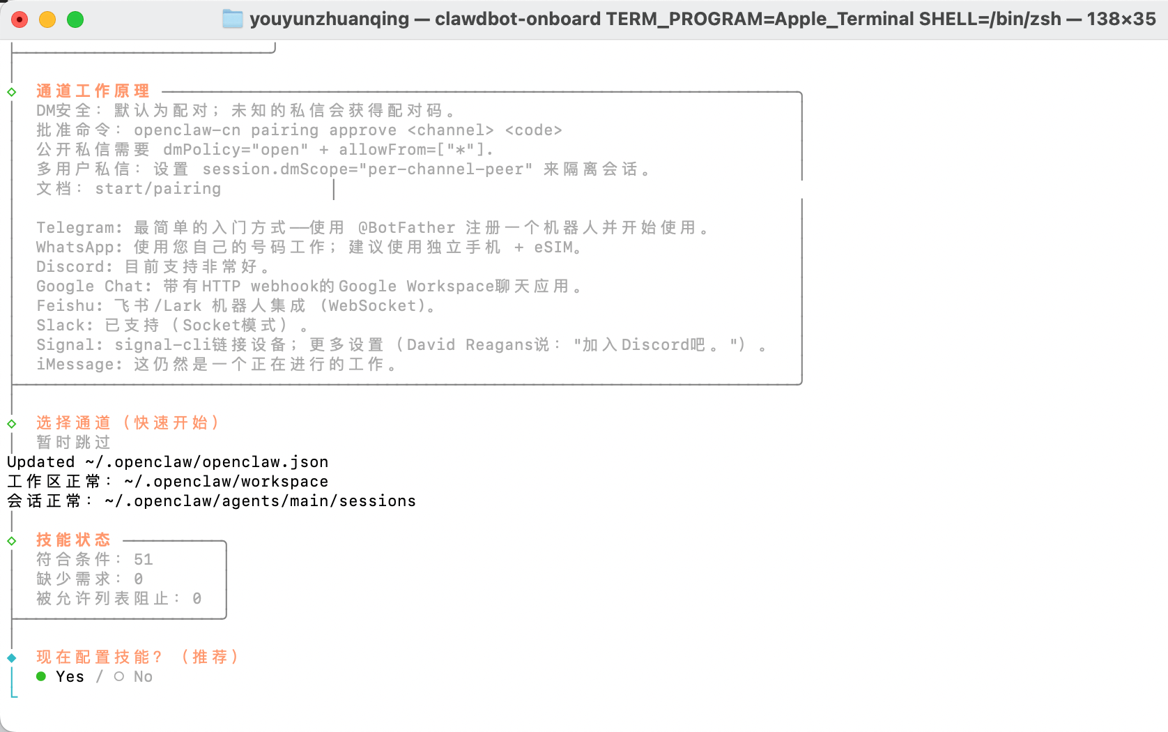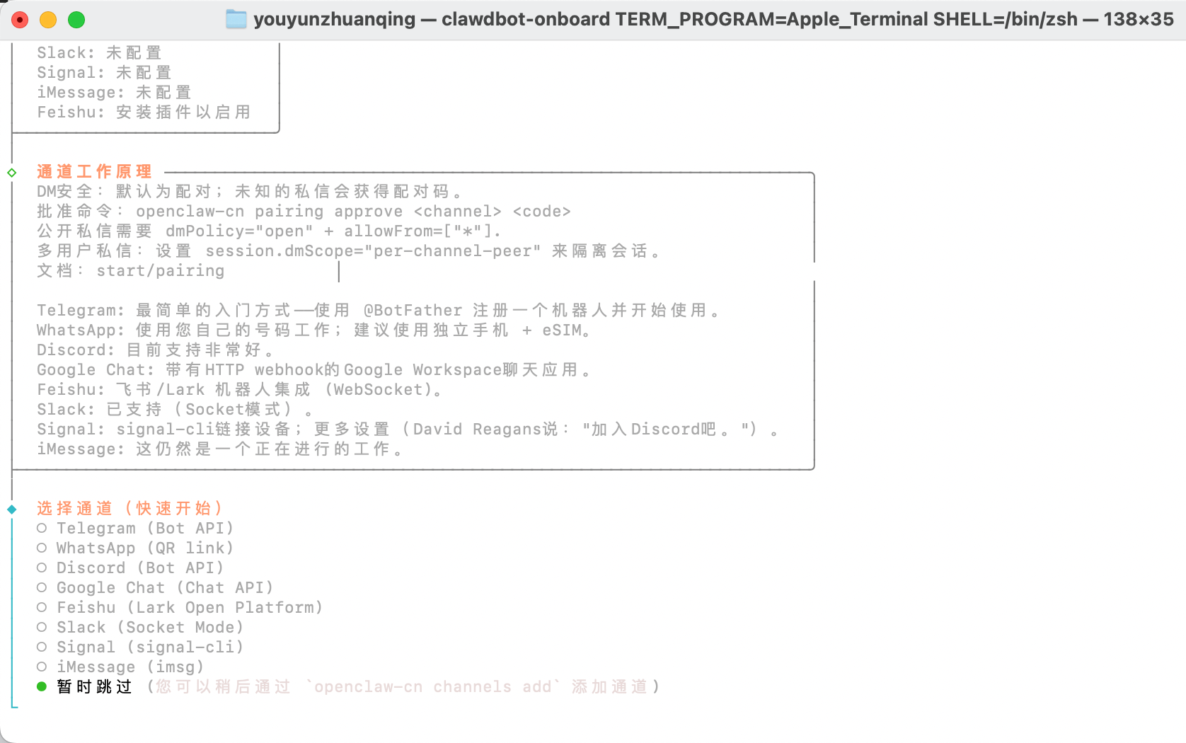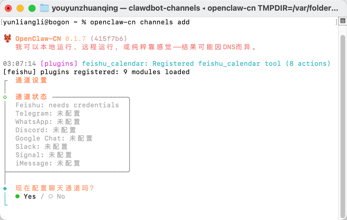 运行 openclaw-cn channels add 添加了 Feishu 渠道