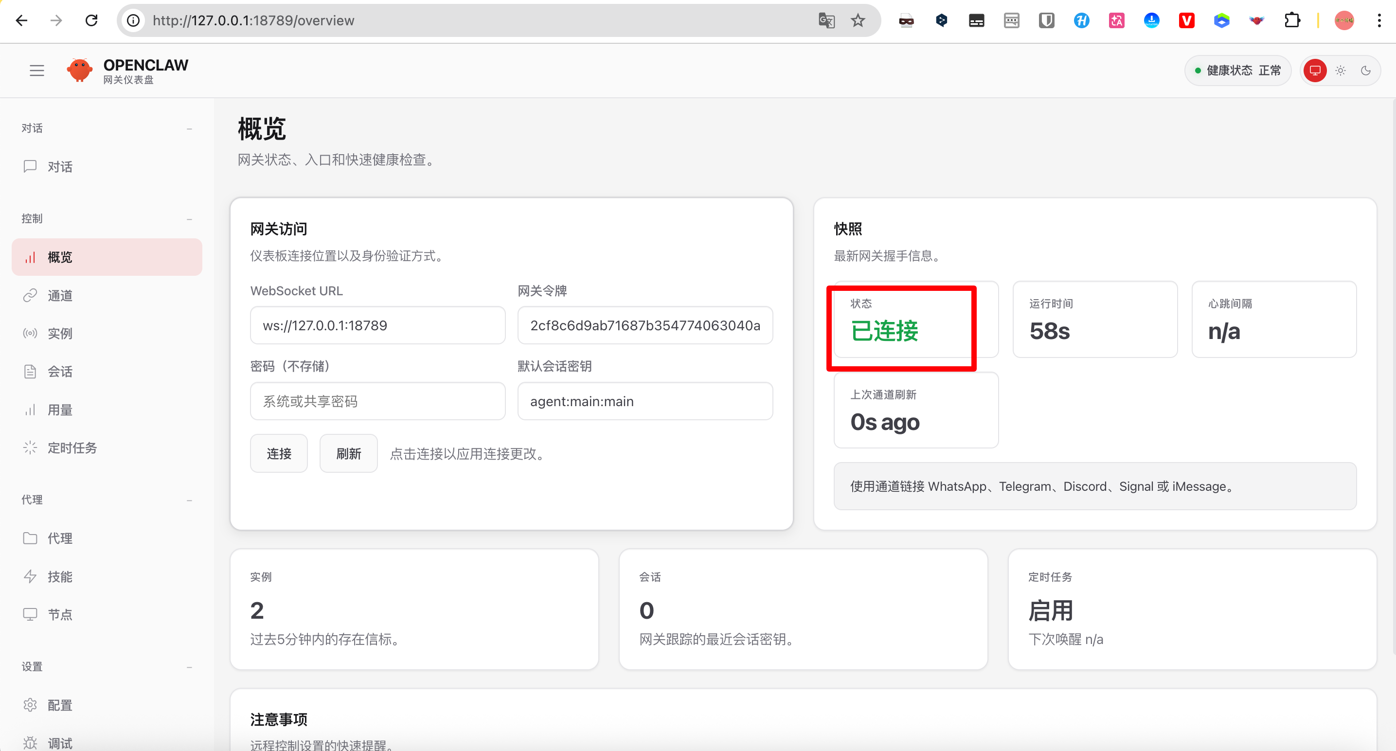 网关处于启动状态(可通过 openclaw-cn gateway status 检查状态)
