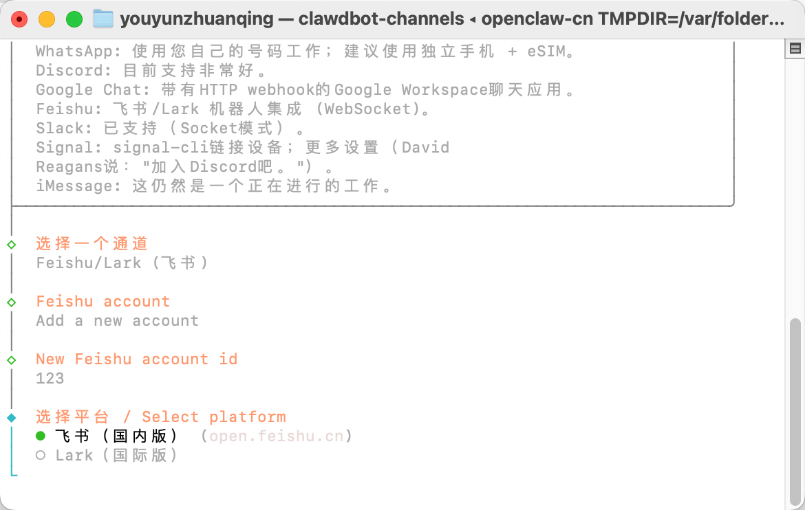 然后根据交互式提示选择 Feishu,输入 App ID 和 App Secret 即可。