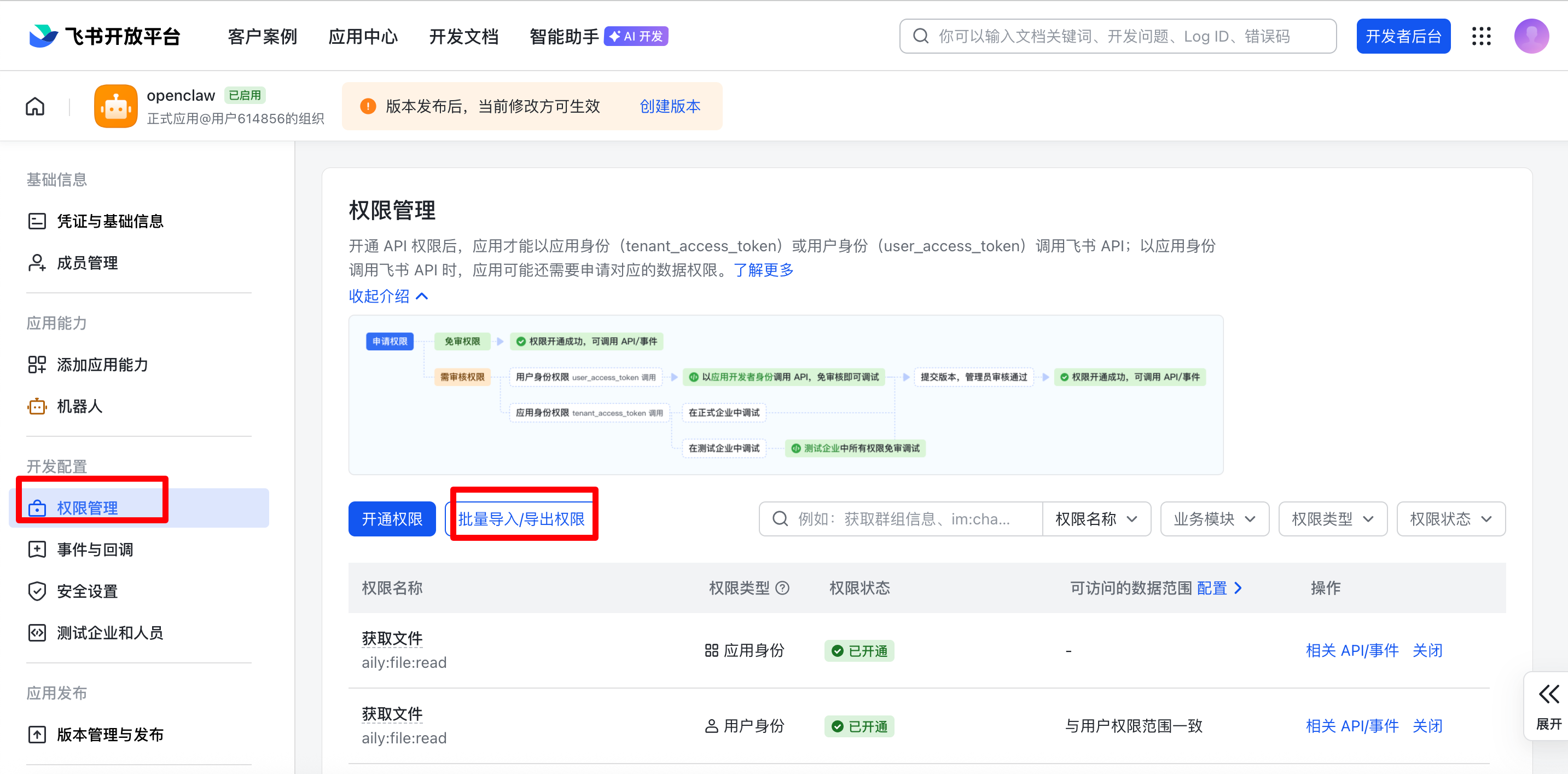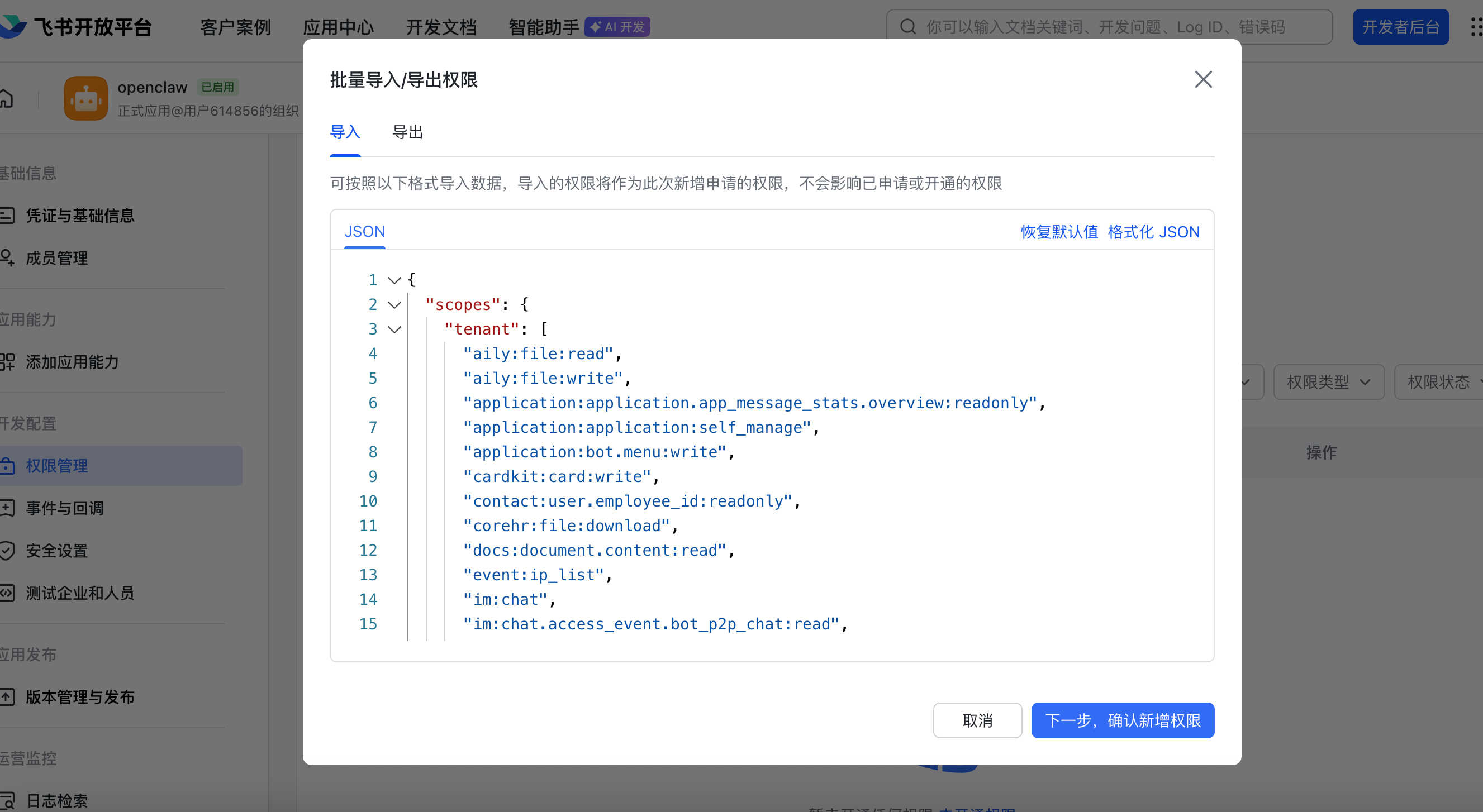 在 权限管理 页面,点击 批量导入 按钮,粘贴以下 JSON 配置一键导入所需权限: