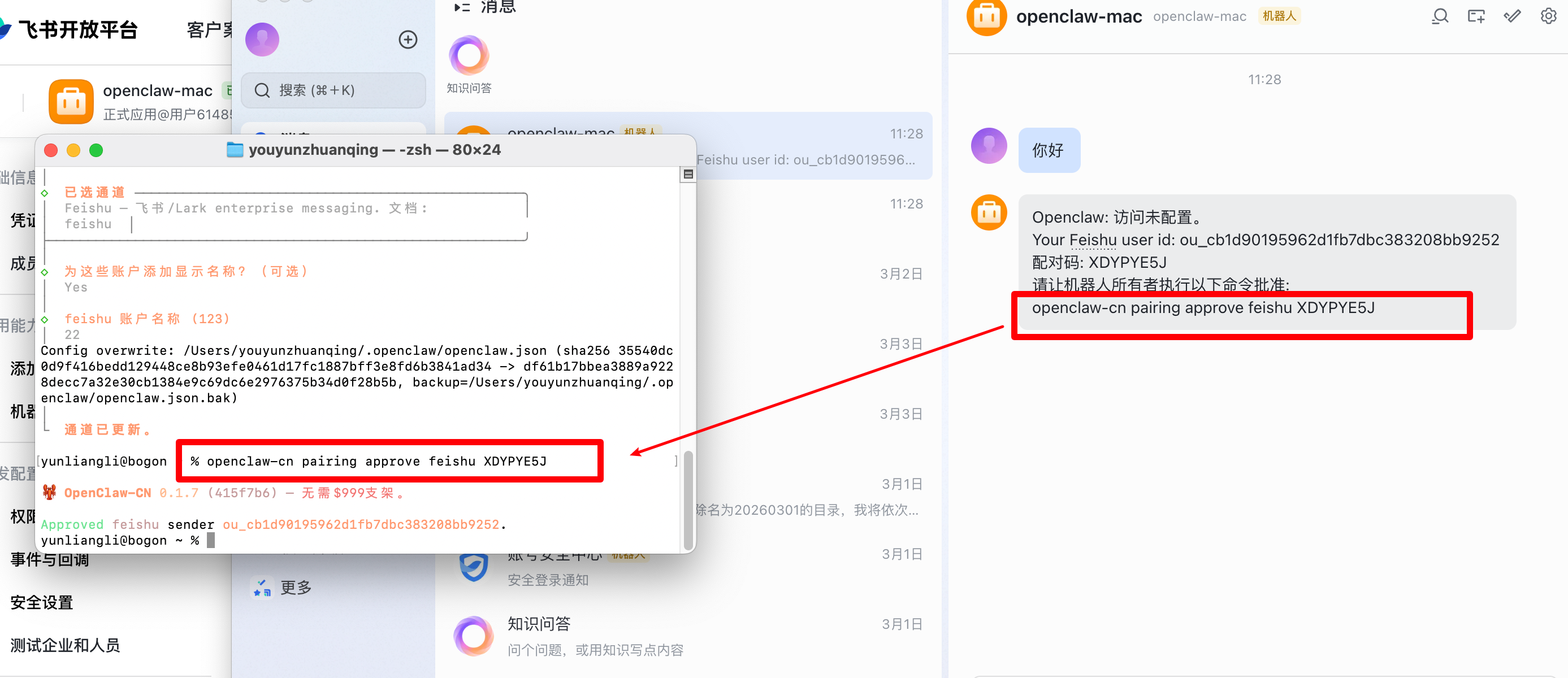 openclaw-cn pairing approve feishu <配对码>